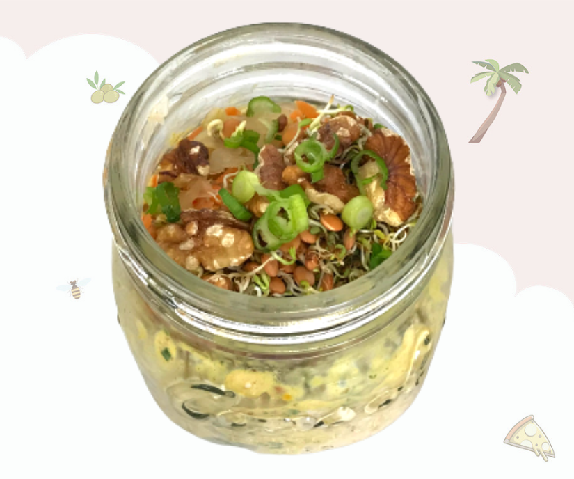 - 3.Top with kimchi, sprouts and walnuts